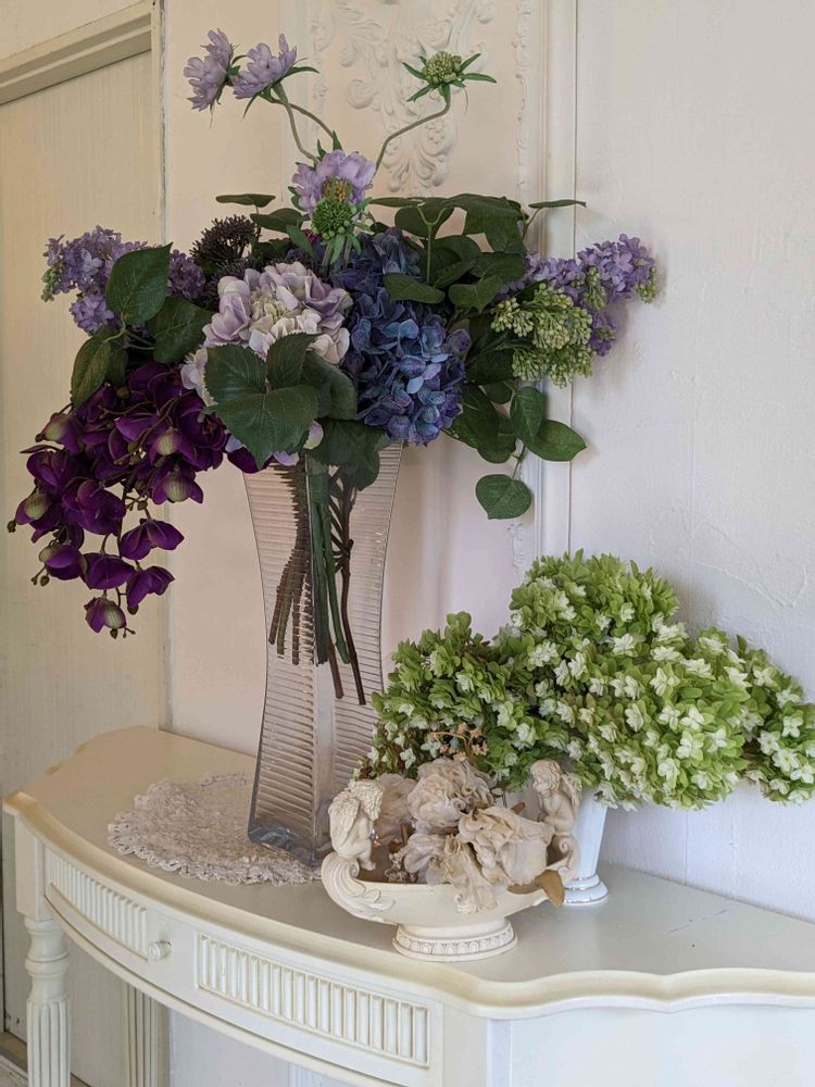 素敵なフラワーアレンジメントと綺麗なカシワバアジサイですね~٩(๑ᵒ̴̶̷͈᷄ᗨᵒ̴̶̷͈᷅)و♪💓