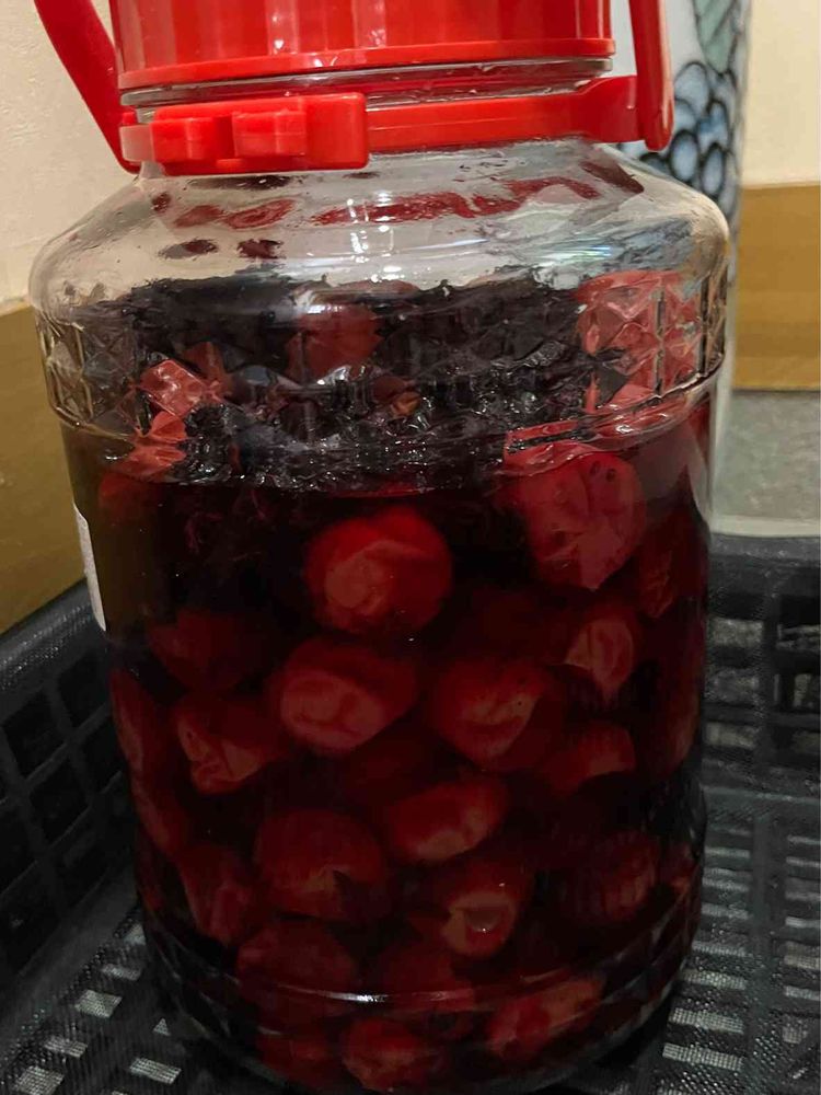 3日間の天日干しが終わり又元の汁に戻しました 赤紫蘇の汁を吸ってまーるく膨らみました こうして寝かせます