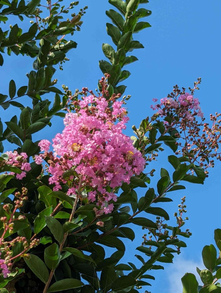 スズシロさん始めまして、青空にサルスベリ真夏日🥵👒🌂の花💐です♪色の種類もあり可愛い💕花ですよね🌸🌸(^ - ^)。