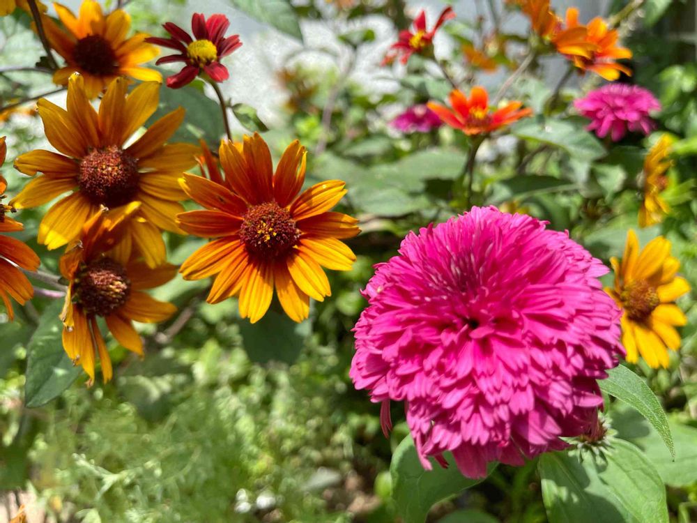 姫ひまわりとエキナセアが花壇で元気に明るくコラボしています♫
