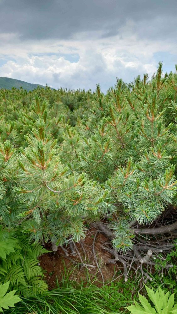 学名:Pinus pumila。マツ科マツ属の常緑針葉樹の低木。 本州中部〜北海道の高山帯,東アジアの寒帯に広くはえる。 ふつう幹は地をはい,枝上に密につく葉は5本束生,葉鞘はなく,3稜形で先がとがり,白みを帯びる。