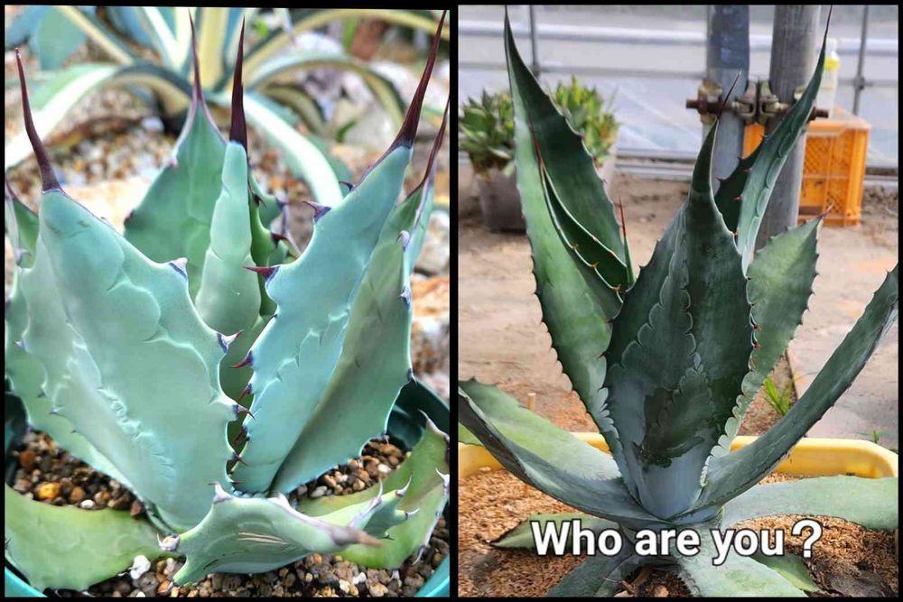 左はシュリベイマグナです。右は昨年、廃業した栽培施設で放置されていたのを救出してきたアガベです。テマカプリネンシスの集団に置いてたし、他の株とも同じ感じだったのでテマカプリネンシスと思って育ててきたんだけど・・・