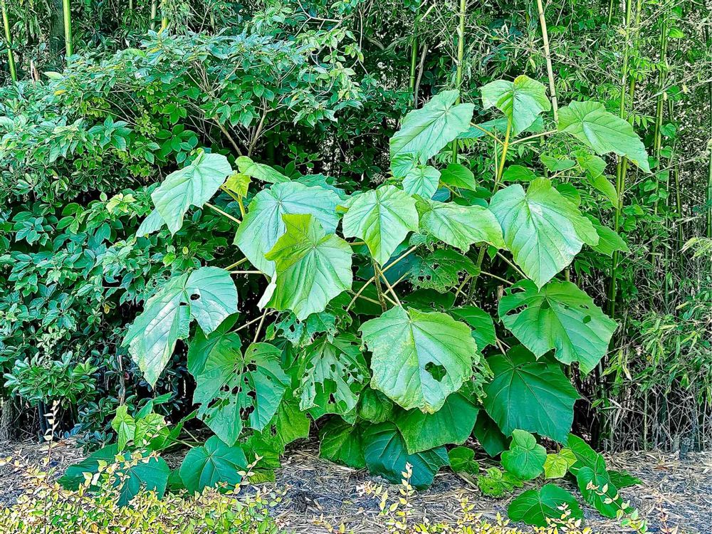 樹高は3m程ですが、葉が横巾60㎝葉のつけ根から先端まで50㎝も有る大きな葉です。近づいて写真を撮って調べたら、桐の幼木の様です。