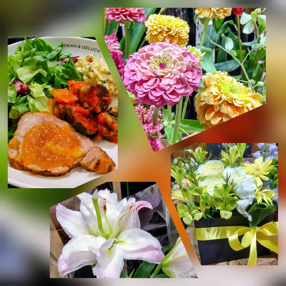帰りの🤎デパ地下のお花屋さんに、ステキなダブルの百合や、ジニア、黄緑アストロメリアにも会えて〜