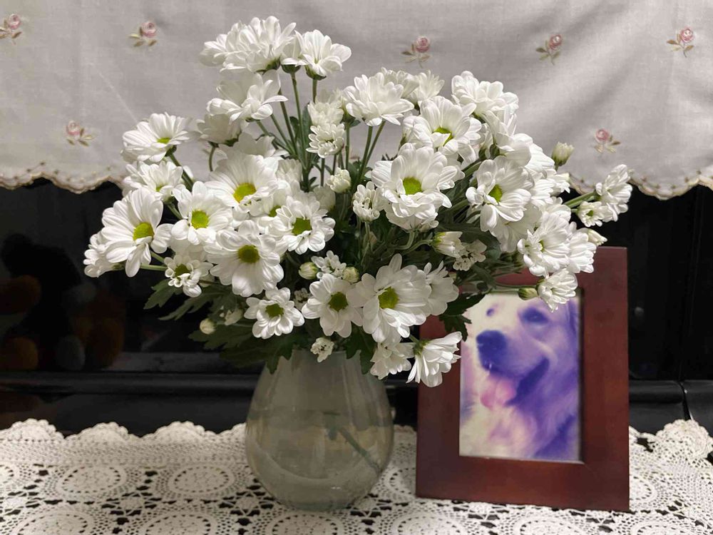 切花の白い菊がとても綺麗だったのでお部屋に‥何気に愛犬の写真も飾る。