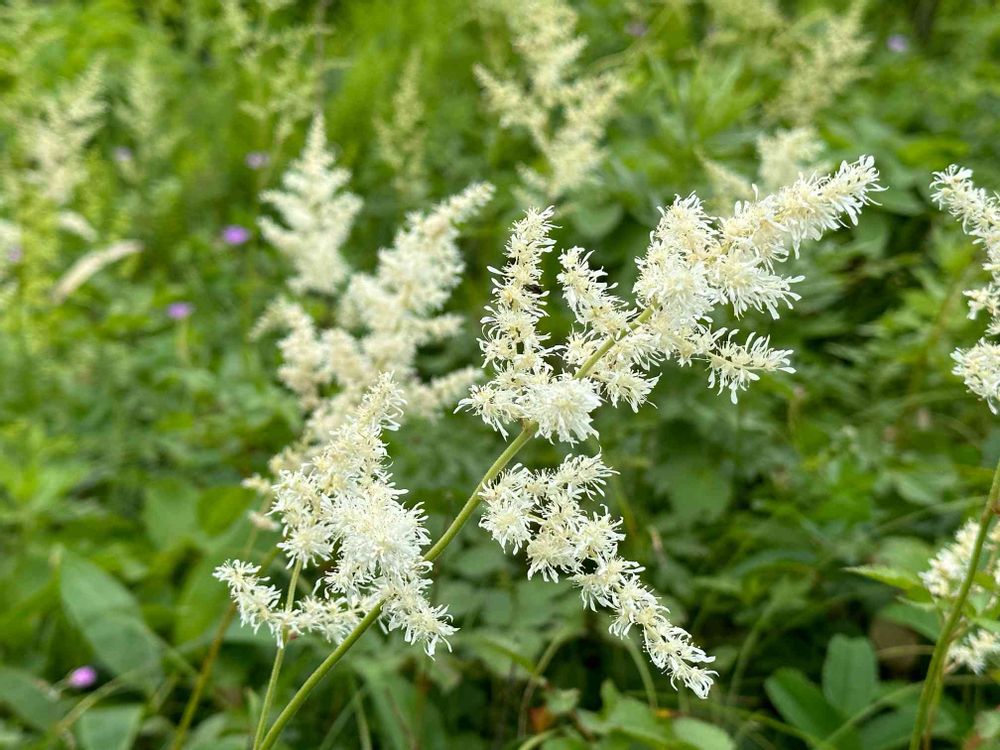 花序が細長い円錐状で側枝はよく分枝し、密に花がつく。花弁は純白色