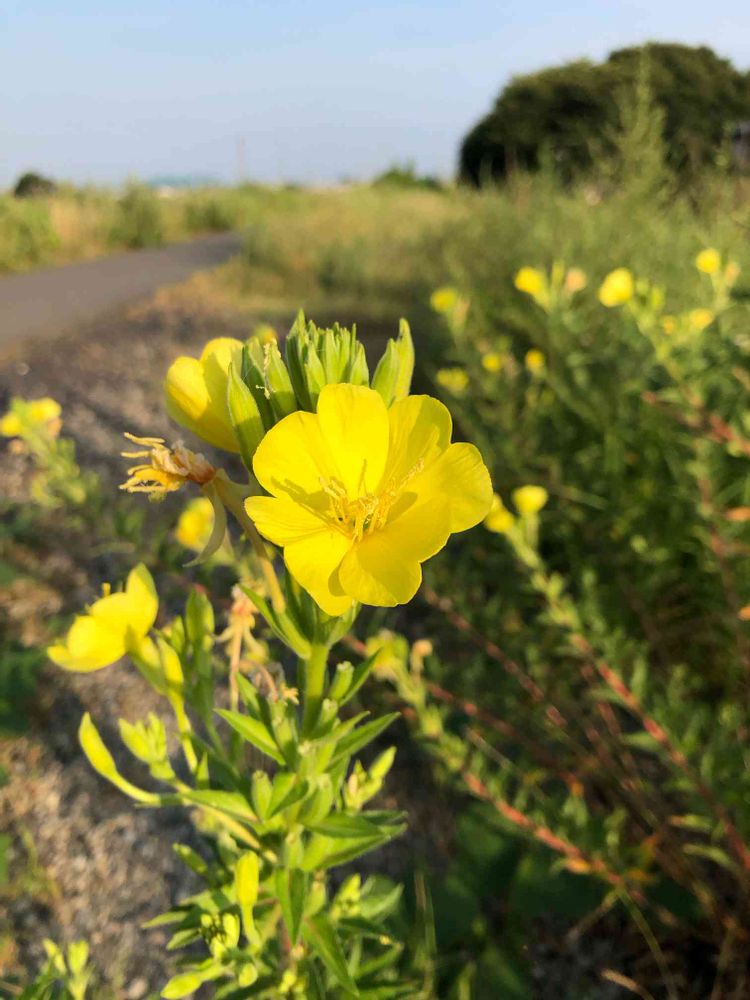 出掛け、土手に黄色い宵待草の花が咲き、目を惹きつけました。