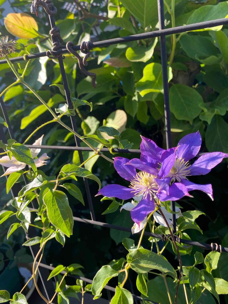 クレマチスが小さいながらも次々と開花💜🤍💜🤍白と紫がランダムに咲いています♪♬💕
