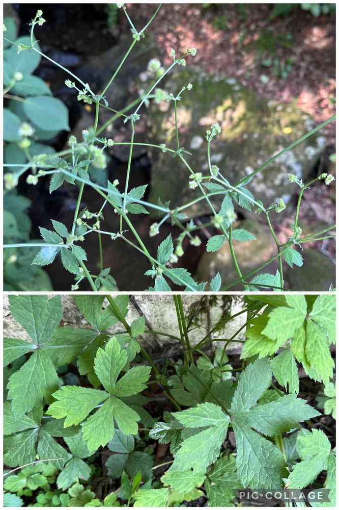 沢の流れに茎を広げてるのは、けっこう大きな草体だけど、生えるのが日陰だし、色味が地味過ぎてあんまり目立たないけど、あちこちに生えまくる「ウマノミツバ」ですね😊 セリ科のウマノミツバ属です。