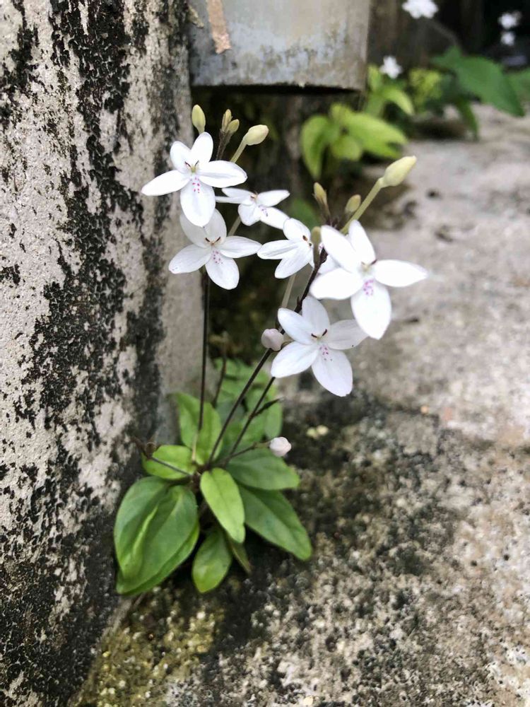 小さな白い花、花は違えどまるでスミレが咲くかのごとく小径に咲いていますね〜カワイイ♡