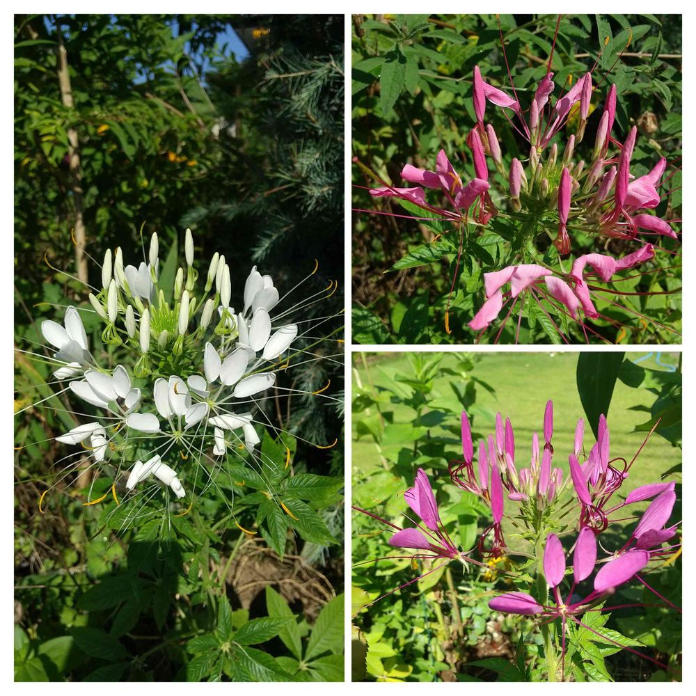 種から育てたクレオメが咲きました。白とピンクの濃いのと明るいピンクの花です。