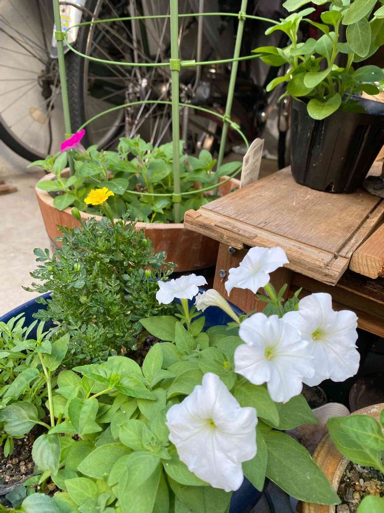 種まきからの、ペチュニア、5個も花が咲いた〜😆白いのきれい😍