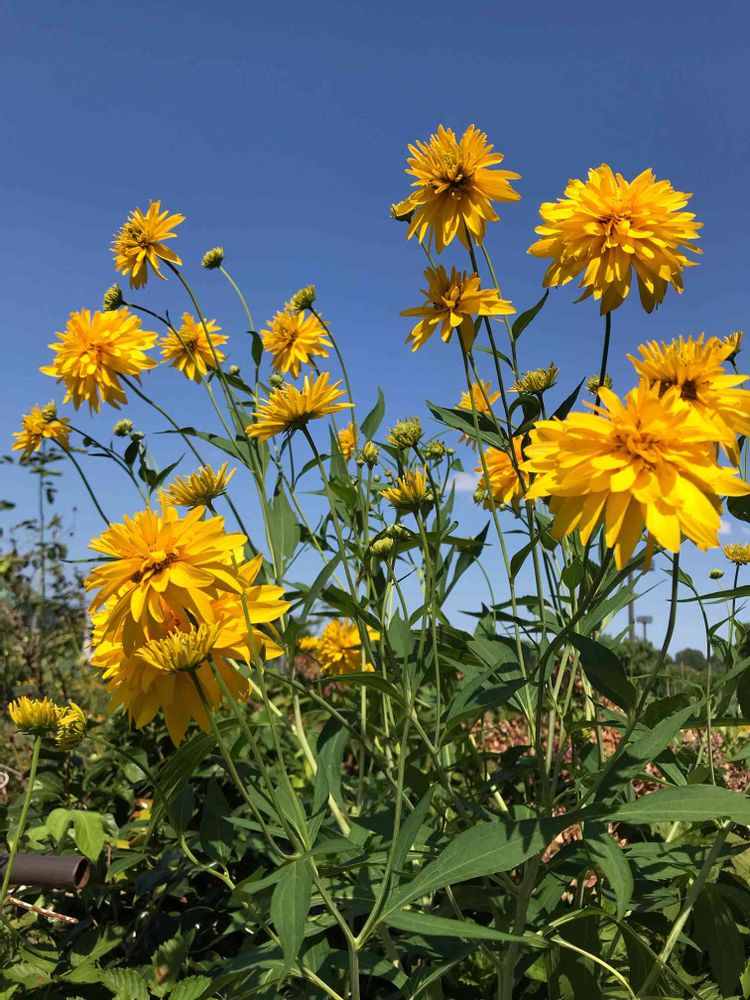 キクイモモドキの八重咲きもあるんですね💛うちは一重で今たくさん咲いてますが〜八重咲きはお花にボリュームがあってステキ✨青空に映えてキレイです😍