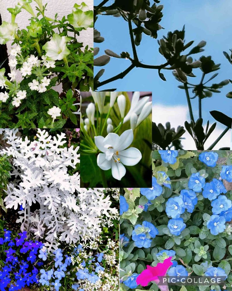 バーベナの白いのとブルー2色のロベリアさんたち、この暑さでトケテo:-)