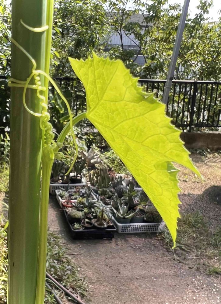 去年一つきりなりかけた実が腐って枯れた糸瓜。その実ごと放置しておいた鉢から今年芽吹いてグングン伸びて、私の身長を超えました。何だか嬉しい。