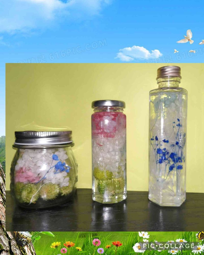 私はSeriaで、1本だけ作ろうと買って来たら、ハ―バリュウムオイルが、3分の2位しか入らず(ビニール袋に入ってるのを2つ、店員さんに聞いたら足りる!)でも足りなかった😆!それからまた、ゆうがたにダイソーに行ったら、プラスチックのボトルに入ってました!もう1本作りたくなり、4本購入して足りました✌️16㌢と14㌢位の蓋付き瓶です✨