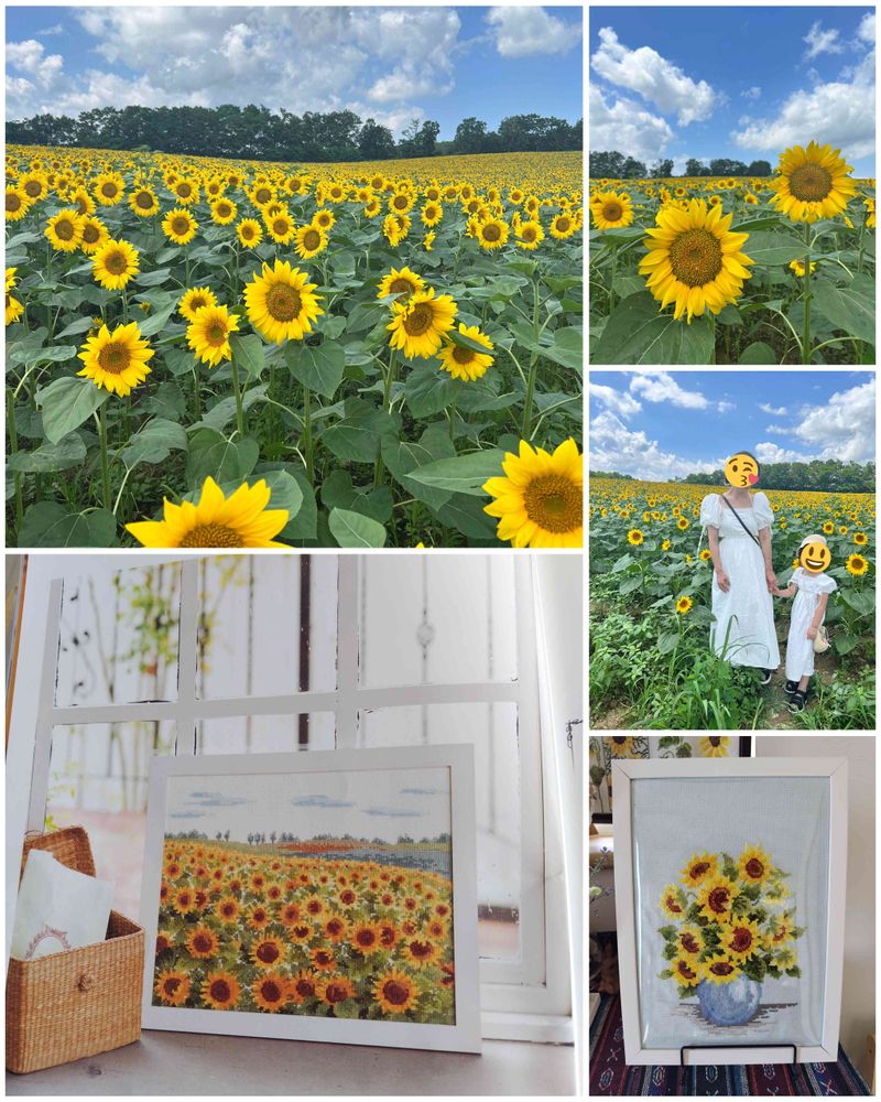 左下picの、一面ヒマワリ🌻畑の刺繍を見て、作ってみたい…と思ったけど到底出来上がりそうもないので諦めた風景にそっくりです👀💦