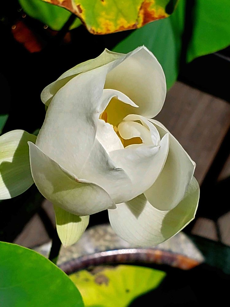 花先に少しだけ薄紅があるはずの「粉椀蓮」なのですが、去年から純白の花が咲くようになってしまいました。