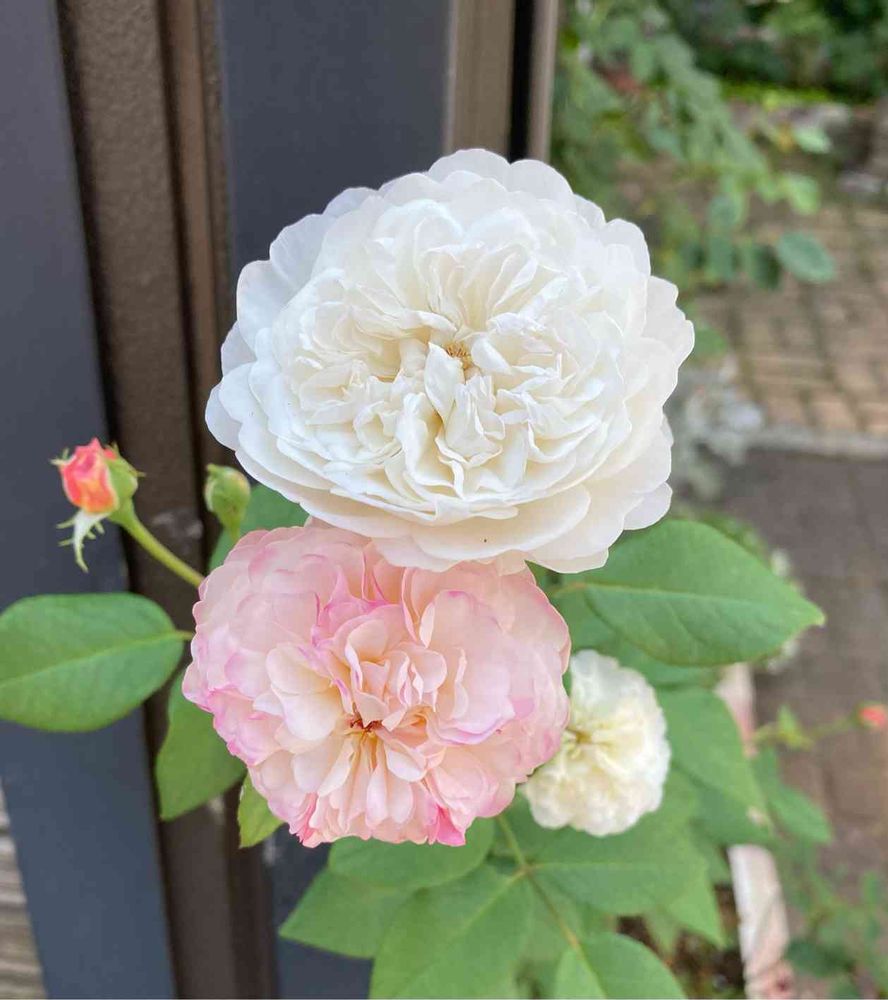 暑い〜💦薔薇ジ オルブラントン ランブラーの3番花が暑い中咲いてます🌸 ガレージの壁面を覆ってくれるのは何年後でしょうか🤔