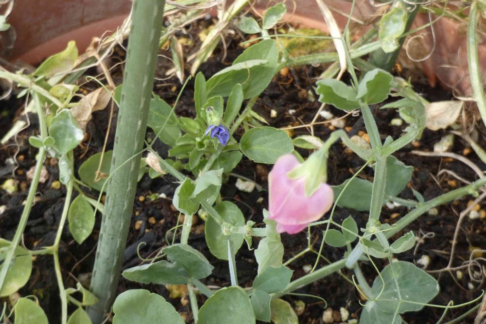 スィートピー💗とこぼれダネからのビオラ💙のふたつの蕾たち。
