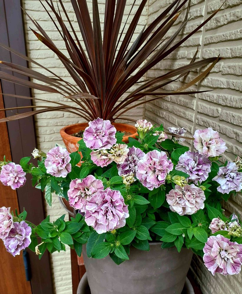 ペチュニアも素敵ですが、後ろのコルジリネレッドスター❓もカッコよくて素敵です🥳