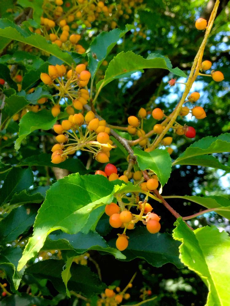 花後にできる果実は、円形に近く、このように黄色~赤~黒紫色に変化する。