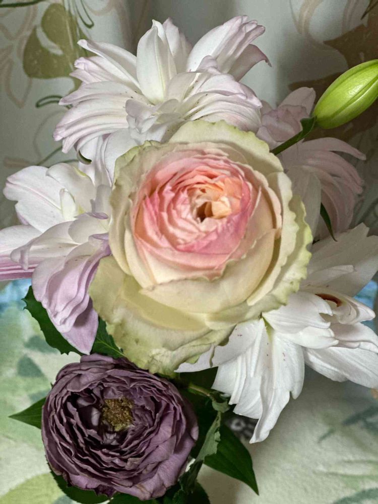 中央が緑で淡いクリームから緑色の花弁にピンクの縁取りがかわいい、ひだまりという薔薇だそうです。お花屋さんから購入しました。