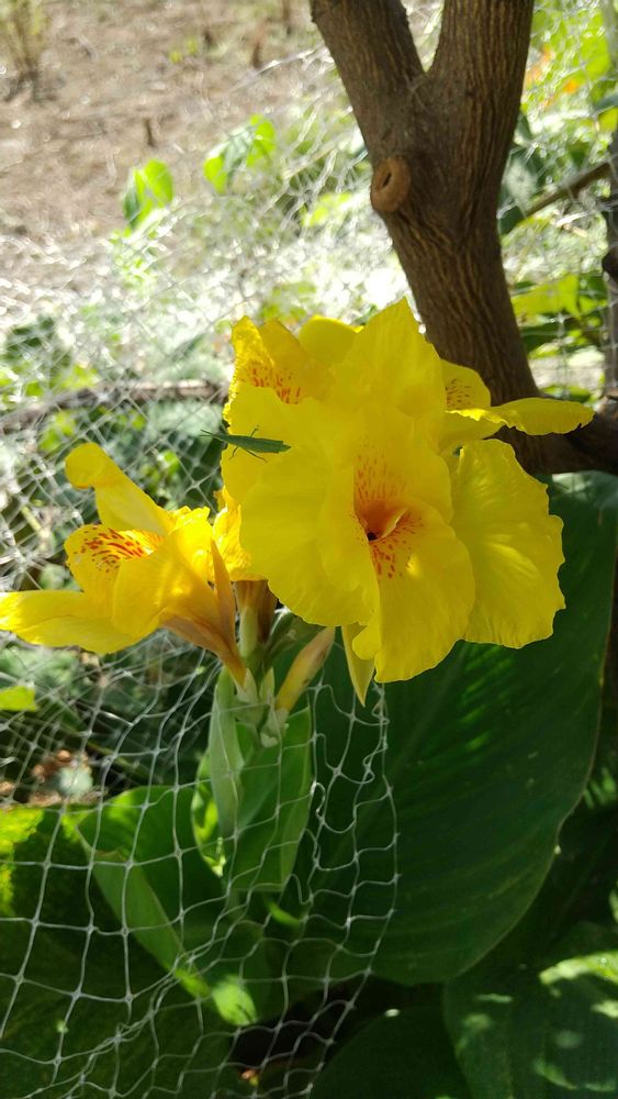 カンナが咲いています。網はハクビシンからブドウを守るためです。