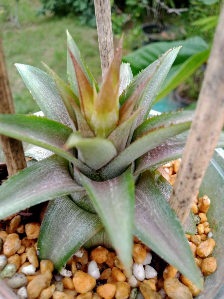 先日収穫した沖縄ピーチパイン🍍(品種名ソフトタッチ)、冠芽を挿木した所、中央部の成長点の葉(やや赤っぽい所)が伸び始めました。どうやら活着した様です。
