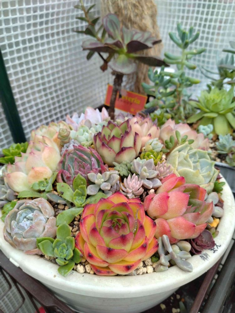 豪華な多肉植物の寄せ植えですね。売っているのかしら?