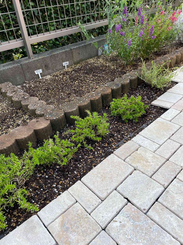 決して広くない庭ですが、草取りがなかなかの負担なので、少しでも草取り面積少なくしたくて、一部に防草シートを敷き石畳風タイルを敷きました。ちょっと残った隙間にプランター植えしていた芝桜を更に隙間にタイムを植えて見ました♪