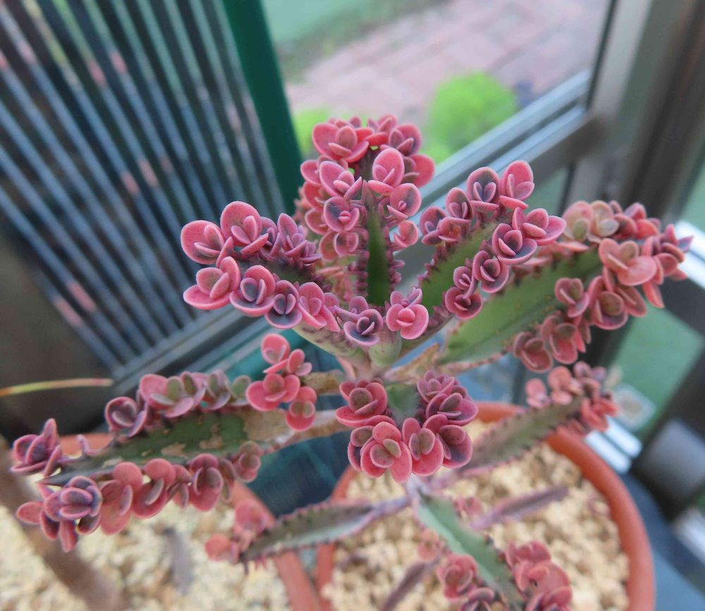 夏に子株ができるようで,他の多肉が平凡な色になる中,花のようなピンクの子株が彩りを添えている。