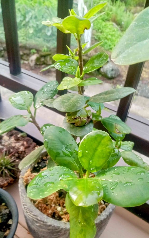 あ!!!ガジュパンにいる🤩🤩🤩ちょいと弱々しいパンダガジュマル😮💨この子はなかなか大きくならないの😱😱😱て、太っちょカエルちゃん🐸ハンバーガーみたい😂😂😂