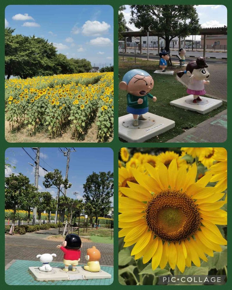 クレヨンしんちゃんたちがいるエンゼルドーム(子どもたちの遊ぶ施設)の前にひまわりがたくさん咲いています。
