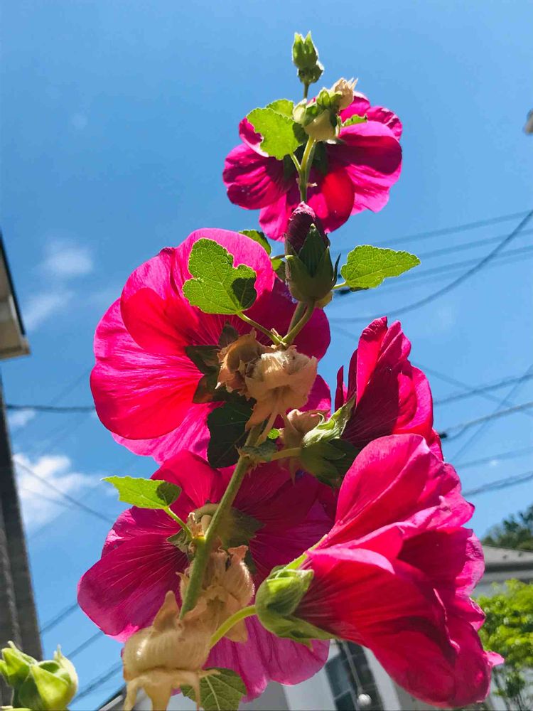 青いお空とタチアオイです。おはようございます😊🌈🎶GSの通知で今日のお花がタチアオイだと知りました🙌