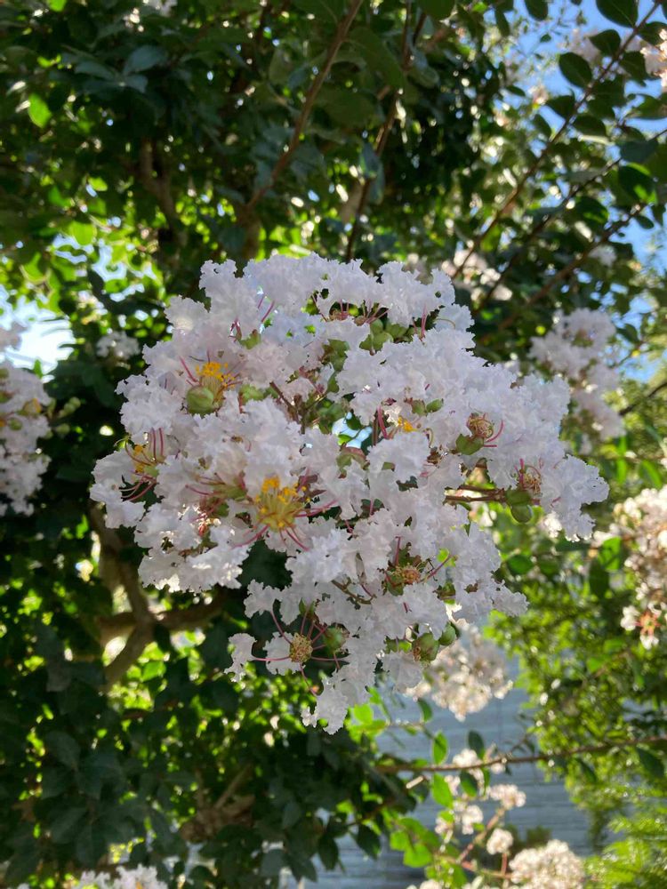 信号待ちでふと見上げてみたらサルスベリの花が涼しげに咲いていてまるでお祭りの縁日に出てくるかき氷みたいで、気持ちだけですが、心に一服の涼が訪れました。