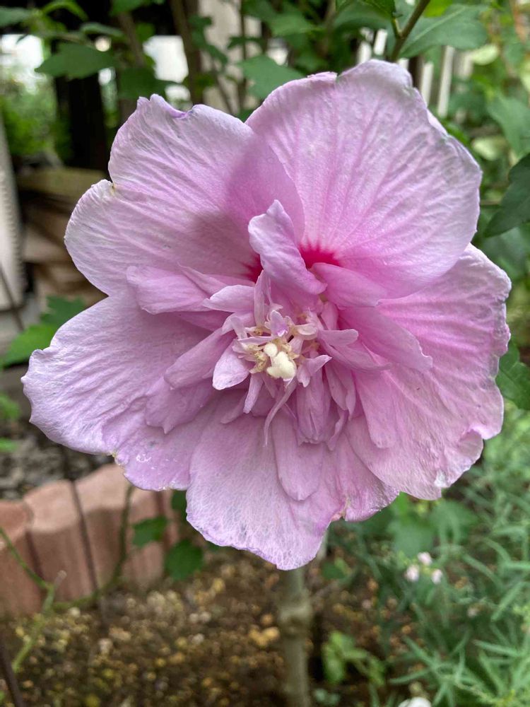 帰ったらムクゲ大徳寺花笠が咲いていました🌸去年秋にお迎えした子で、お顔を見たのは初🥰うれしい〜💕これは八重に入るのかな?🤔