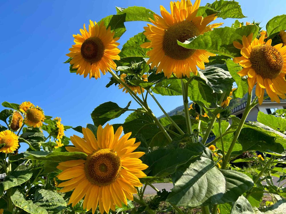 晴れ渡る日差しの中向日葵🌻はバリバリ元気ですね〜 ୧⃛(๑⃙⃘•ω•๑⃙⃘)୨⃛