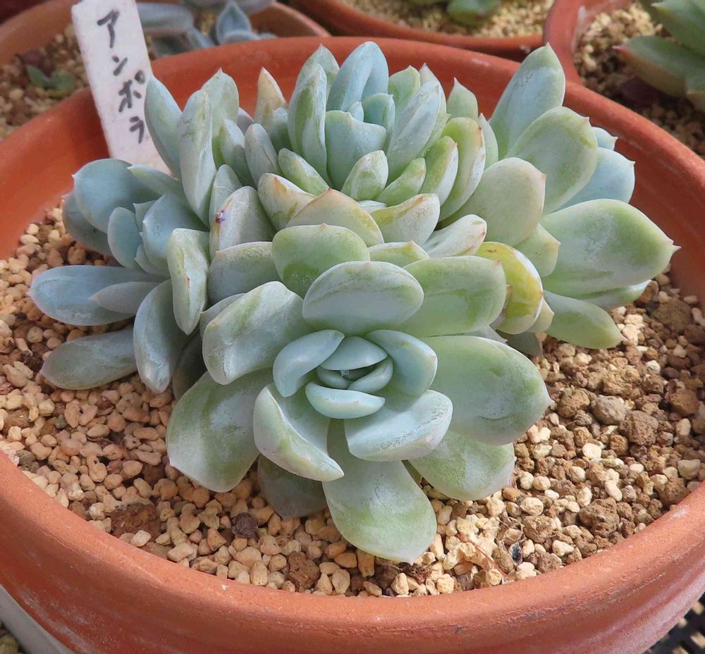 冬は見事な色合いになるアンポラもすっかり緑に戻った。多くのエケベリアよりも色が薄くて白に近い分上品さが残るけど,やっぱり夏は普通の姿。