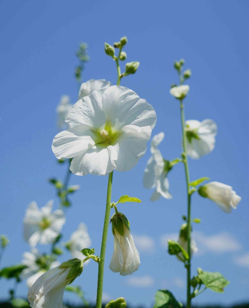 白色の清楚なタチアオイの花は、青空に映えてとてもいい感じですね🤍🌿