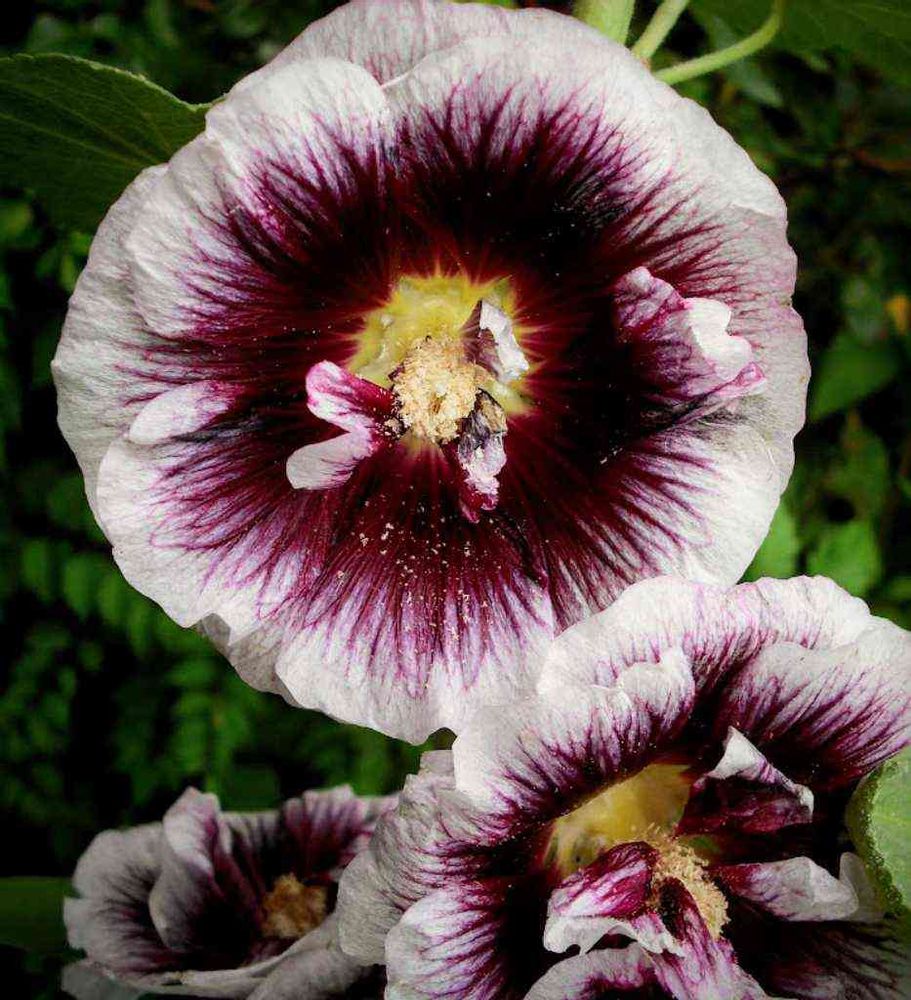 今日のお花、タチアオイです。今は育てて無いので過去写真から~これはクレームドカシス( Alcea rosea 'Cre'me de Cassis')という品種で、白地に濃いカシスパープルの二色咲です💜😍🤍😍名前が美味しそうですね😋色幅は出やすくて、カシスの部分が、濃いローズピンクみたいに発色することもあります。