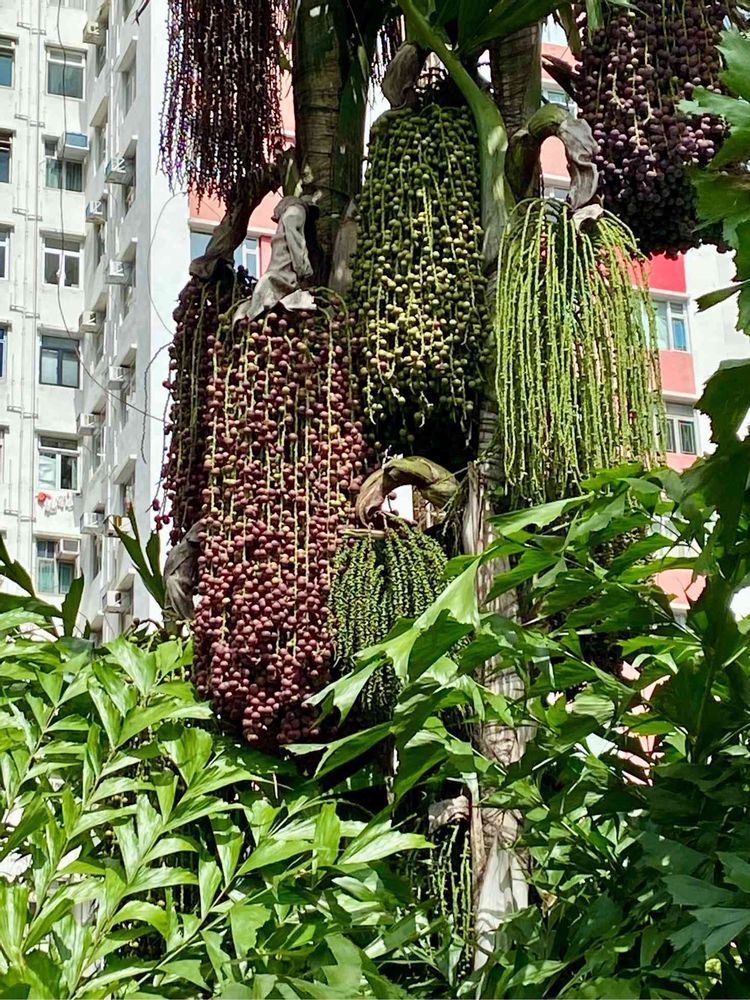 こちらのコモチクジャクヤシは立派ですよね〜! 私が観察してるものより房が大きくてジャラジャラが長い気がします。🤔 私も継続的に観察中で今は花が咲いてから実ができるまで、また実が青からカラフルな実に変わって最後は黒くなって落ちるまでどれくらいの期間を要するのか自由研究中です。🤓📓😆😆😆