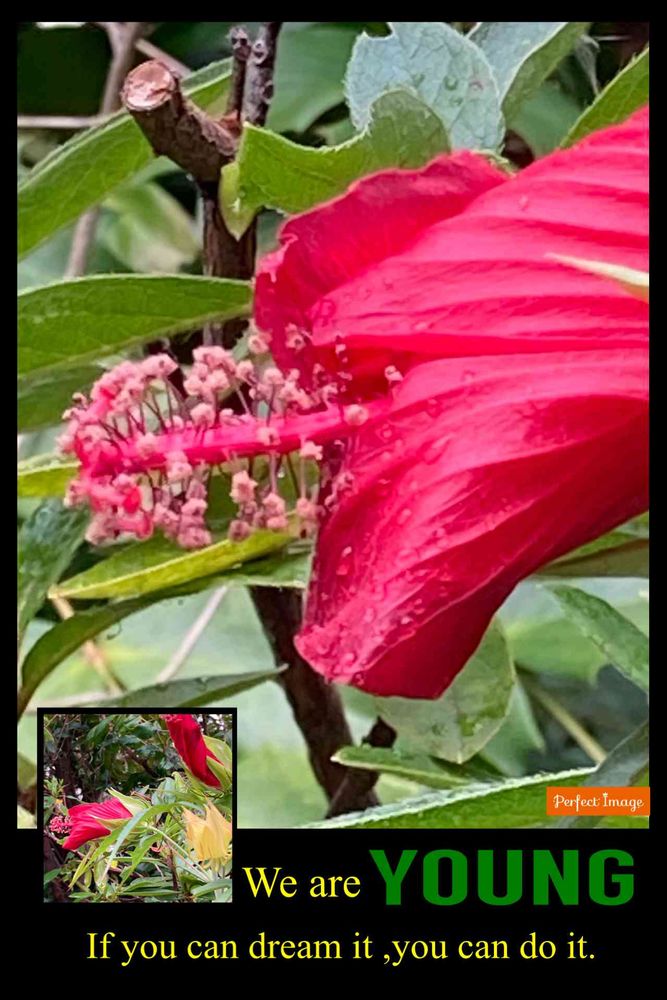 モミジアオイの咲いた後の花姿です。長いシベだけが花びらの中に入りきれずのぞいてます。