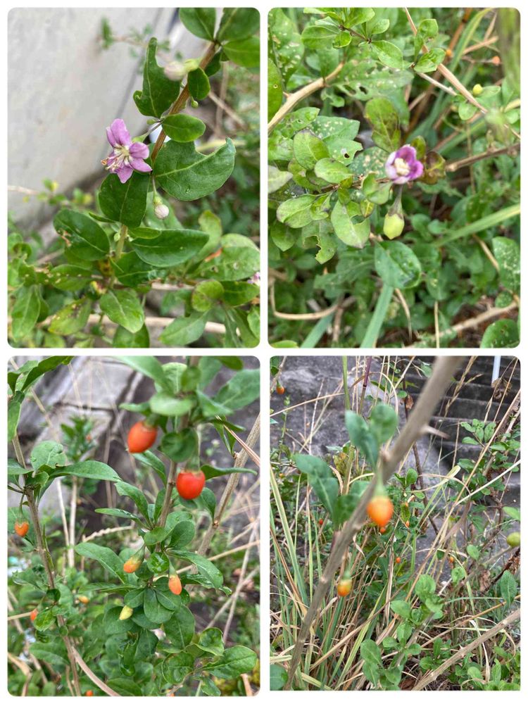 雨上がりの朝に「クコ」を見つけた。オレンジ色の実がなっていて、辛うじて紫色の可憐な花も2輪咲いてくれていた。