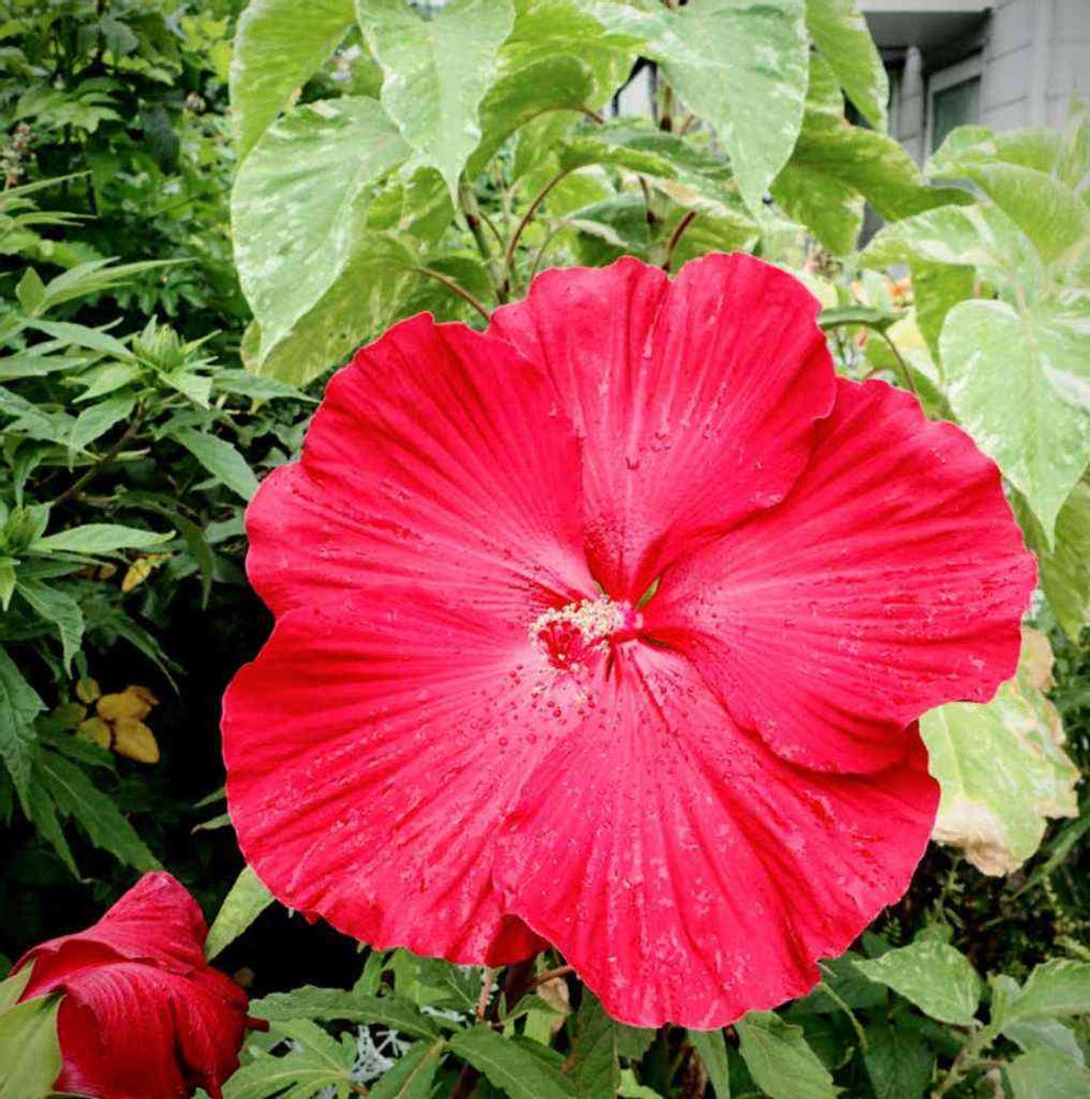 雨に濡れても元気です😃後ろに見える斑入りの葉っぱは、オオケタデ・ミスターバリエガータ-Yです。