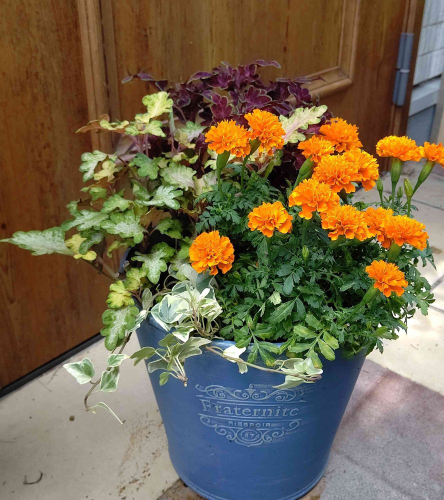 コリウスの紫色とマリーゴールドのオレンジ、鉢にとっても合ってますね☺️
