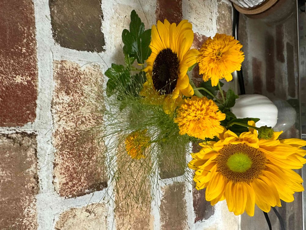 家や家族をもっと明るくしたり、自分磨きをしようと思って毎月花を買うことにしました。8月はこちらです! ひまわりとマリーゴールド?と緑の花火のような植物はなんでしょう、、、? ひまわりも種類があるんですかね🤔 中心が黒いのと緑のものがありますね、良ければ教えてください🙏
