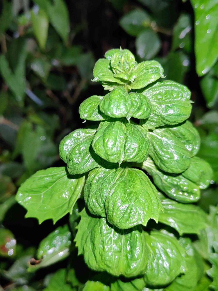 久々の雨 明日(もう今日)は灌水が不要らしく真夜中に外に出てみた前から気になる大葉何処か変なんです気になるので縮緬(チリメン)で検索するも違う様です敢えて花から実 種と楽しみ〜でも猛暑に耐えられるか