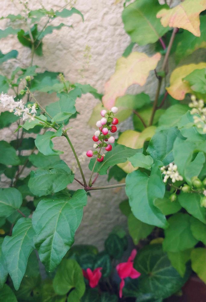 おっ、ジュズサンゴ、紅❤️白🤍が共演しています👀、と📸していたら天敵の蚊🦟がぁ〰😱 見ただけでかゆくなります😬🤭