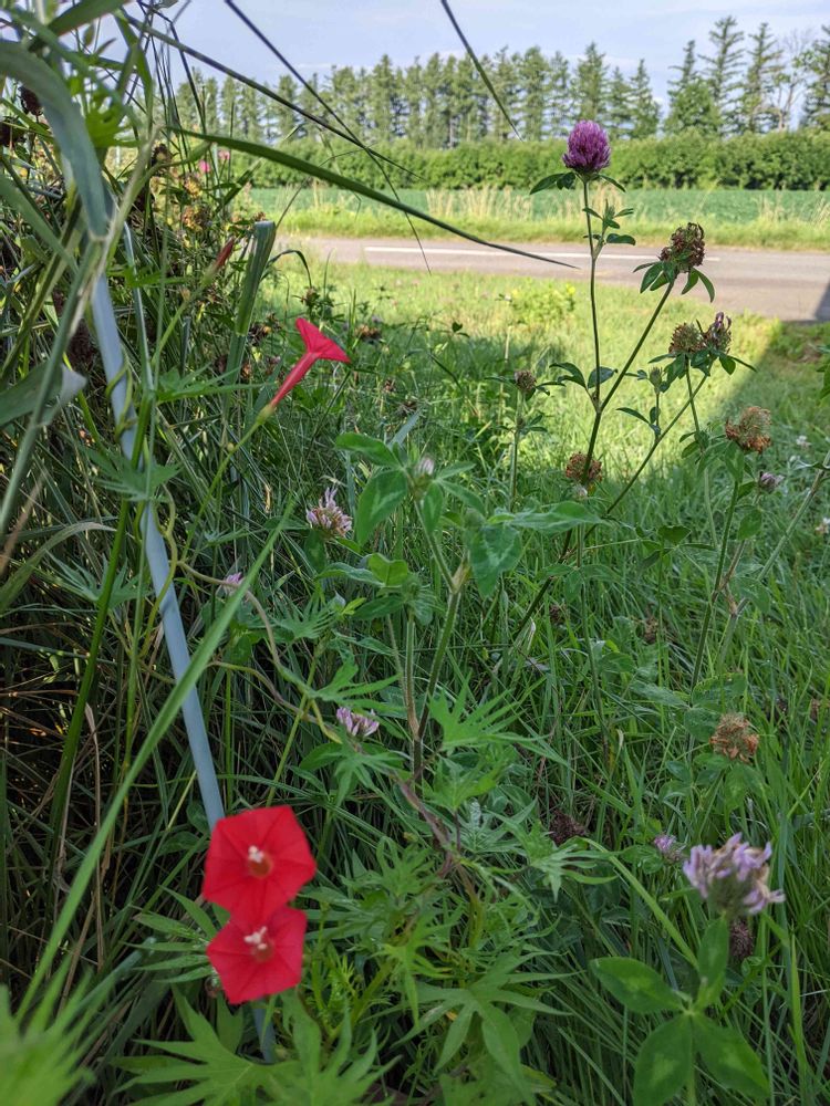 3箇所に鉢を置いてみましたが、他の植物や雑草の中に置いたこの子が一番乗りてす。日照りから守られて活き活きしています、